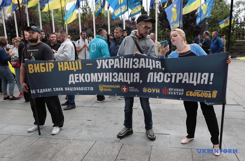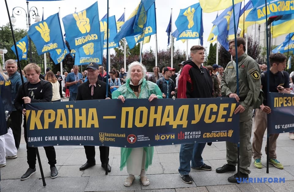 Митингующие держат плакаты с надписями: "Нет - торговле украинской землей!", "Украина - превыше всего!", "Выбор нации - украинизация, декоммунизация, люстрация!", "Украина - превыше всего! Президент, служи украинцам, а не олигархам и оккупантам! ".