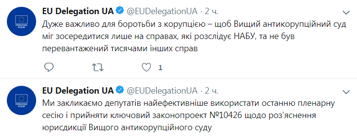 Представительство Евросоюза призывает депутатов украинского парламента принять законопроект о работе Высшего антикоррупционного суда (ВАКС). Призыв опубликован в официальном Twitter организации.