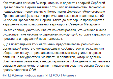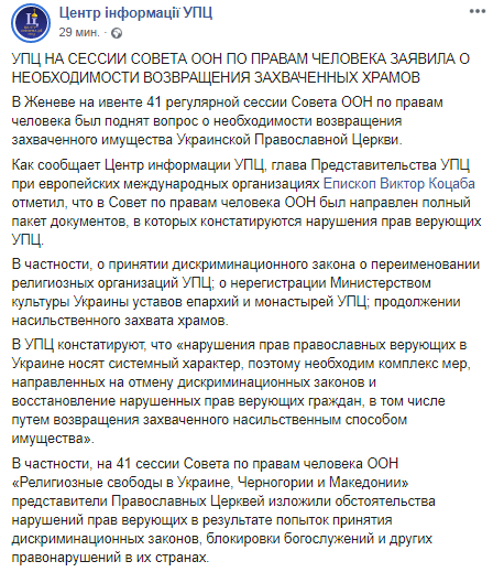 Глава Представительства УПЦ при европейских международных организациях епископ Виктор Коцаба заявил, что в Совет по правам человека ООН был направлен полный пакет документов, в которых констатируются нарушения прав верующих УПЦ. В частности, о принятии закона о переименовании религиозных организаций УПЦ; о нерегистрации Министерством культуры Украины уставов епархий и монастырей УПЦ; продолжении насильственного захвата храмов.