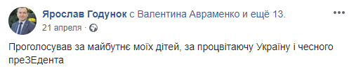 "Проголосовал за будущее моих детей, за процветающую Украину и честного ПреЗЕедента", - подписал фото автор поста.