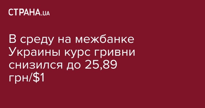 Курс гривни на межбанковском валютном рынке в среду снизился до 25,89 грн/$1 с 25,635 грн/$1 в предыдущий рабочий день. Об этом сообщает "Интерфакс-Украина" со ссылкой на дилеров коммерческих банков.