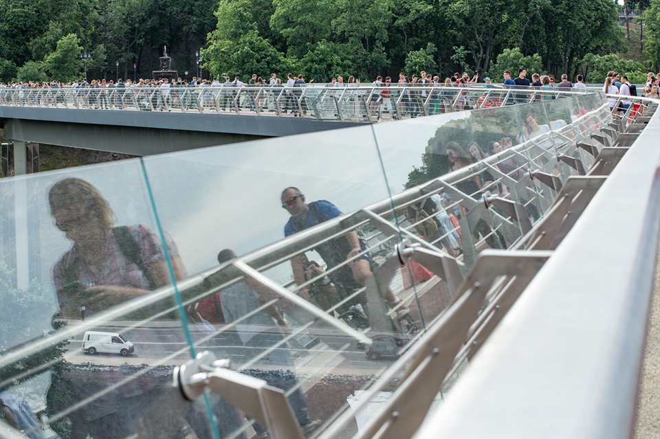 Однко уже 1 июня в Киеве на новом пешеходном мосту треснуло еще одно стекло.