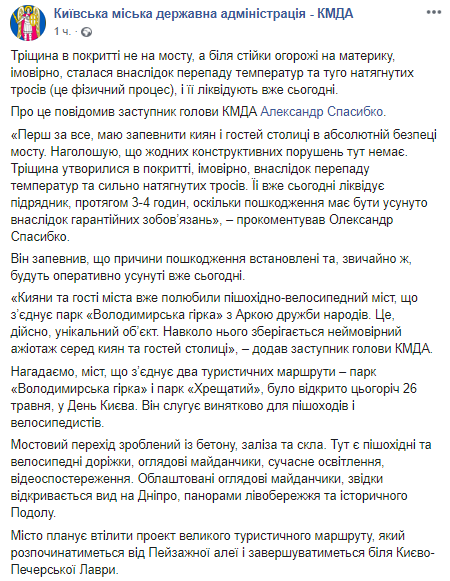 В КГГА заверили, что образвавшаяся на недавно открытом в Киеве пешеходно-велосипедном мосту трещина совершенно безопасна. По словам заместитель главы КГГА Александра Спасибко, трещина в покрытии не на мосту, а у стойки ограждения, вероятно, образовалась из-за перепада температур и туго натянутых тросов (это физический процесс) и ее ликвидируют уже сегодня. ООб этом сообщается на странице КГГА в соцсети.