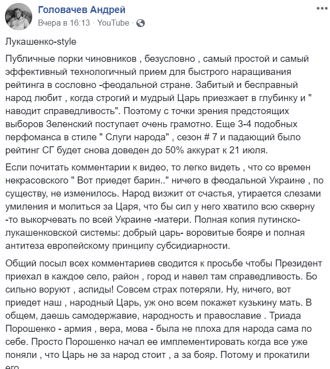 "Публичные порки чиновников , безусловно , самый простой и самый эффективный технологичный прием для быстрого наращивания рейтинга в сословно -феодальной стране. Забитый и бесправный народ любит , когда строгий и мудрый Царь приезжает в глубинку и " наводит справедливость". Поэтому с точки зрения предстоящих выборов Зеленский поступает очень грамотно. Еще 3-4 подобных перфоманса в стиле " Слуги народа" , сезон # 7 и падающий было рейтинг СГ будет снова доведен до 50% аккурат к 21 июля.