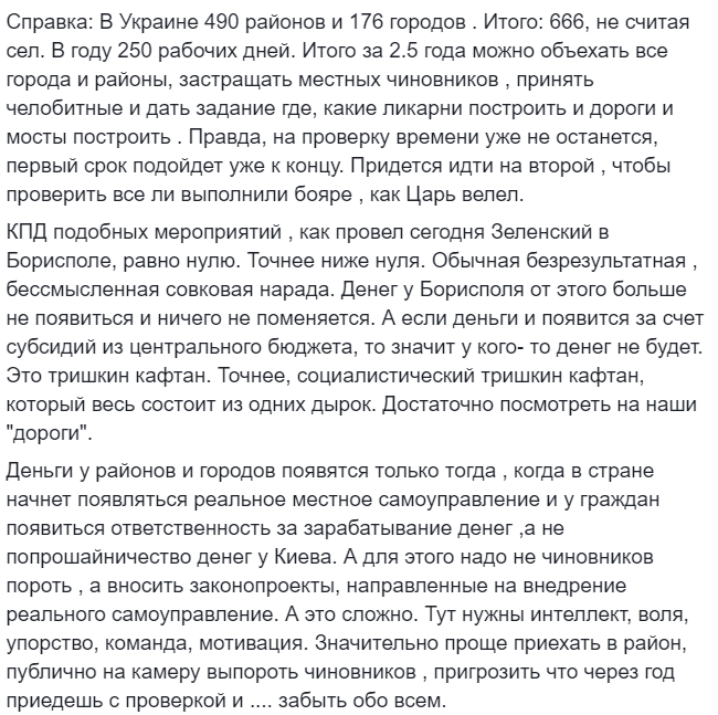 КПД подобных мероприятий , как провел сегодня Зеленский в Борисполе, равно нулю. Точнее ниже нуля. Обычная безрезультатная , бессмысленная совковая нарада. Денег у Борисполя от этого больше не появиться и ничего не поменяется. А если деньги и появится за счет субсидий из центрального бюджета, то значит у кого- то денег не будет. Это тришкин кафтан. Точнее, социалистический тришкин кафтан, который весь состоит из одних дырок. Достаточно посмотреть на наши "дороги".
