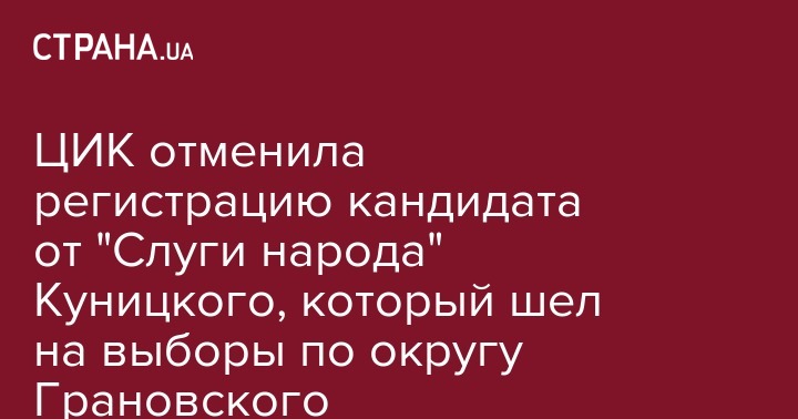 "Следовательно, комиссия частично удовлетворила указанную жалобу и отменила регистрацию кандидата в народные депутаты Украины Куницкого, выдвинутого политической партией "Слуга народа", в округе №169 на внеочередных выборах народных депутатов Украины 21 июля 2019 года", - сообщили в ЦИК.