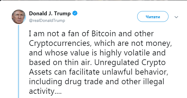 "Я не фанат биткоина и других криптовалют, которые не являются деньгами и чья ценность очень изменчива и держится на слабом воздухе. Нерегулируемые крипто-активы могут способствовать незаконному поведению, включая торговлю наркотиками и другую нелегальную деятельность", - написал президент США.
