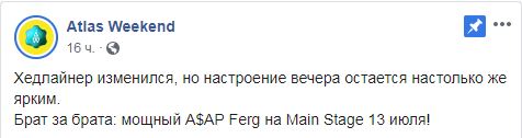 После того, как стало известно, что хедлайнер одного из дней фестиваля Atlas Weekend A$AP Rocky был вынужден отменить свое выступление из-за ареста, ему нашли замену. Об этом сообщили организаторы мероприятия на официальной странице в Facebook.