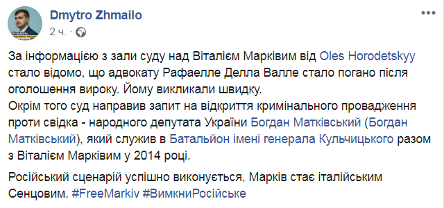 "Суд решил также направить запрос на открытие уголовного производства против народного депутата Украины Богдана Маткивского, который служил в батальоне имени генерала Кульчицкого вместе с Виталием Маркивым в 2014 году", - написал Жмайло.