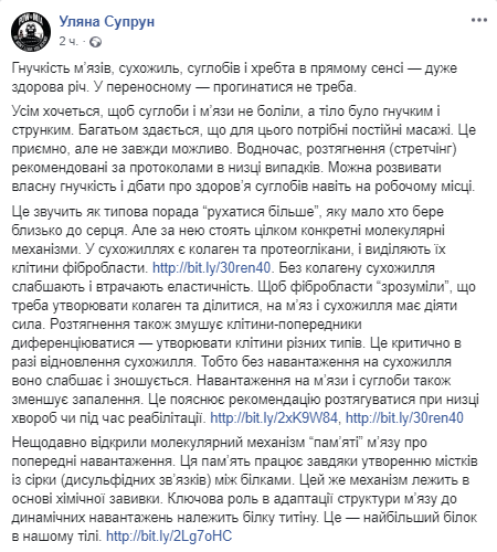 "Это звучит как типичный совет "двигаться больше", который мало кто берет близко к сердцу. Но за ним стоят вполне конкретные молекулярные механизмы. В сухожилиях есть коллаген и протеогликаны, и выделяют их клетки фибробласты. Без коллагена сухожилия ослабевают и теряют эластичность. Чтобы фибробласты "поняли", что надо образовывать коллаген и делиться, на мышцы и сухожилия должна действовать сила. Растяжение также заставляет клетки-предшественники дифференцироваться — образовывать клетки различных типов. Это критично в случае восстановления сухожилия. То есть без нагрузки на сухожилие оно ослабевает и изнашивается. Нагрузка на мышцы и суставы также уменьшает воспаление. Это объясняет рекомендацию растягиваться при ряде заболеваний или во время реабилитации", - пишет Супрун.