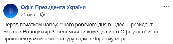 "Перед началом напряженного рабочего дня в Одессе президент Украины Владимир Зеленский и команда его Офиса лично проинспектировали температуру воды в Черном море", – написано в посте.