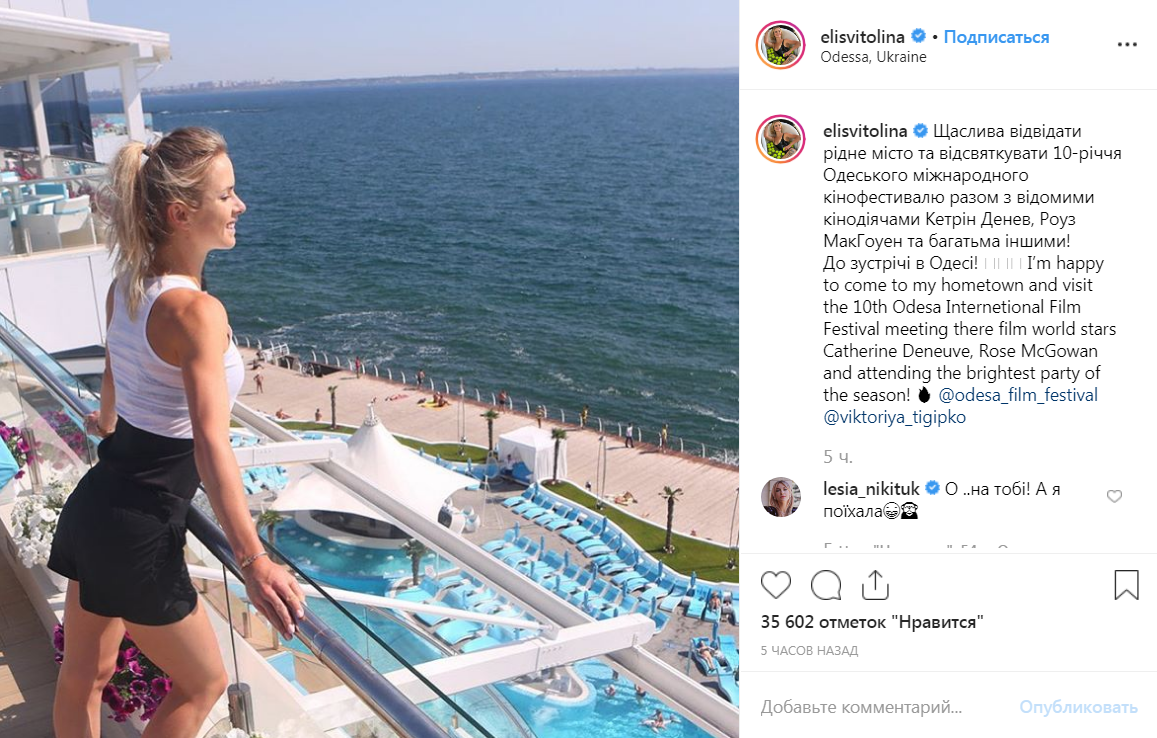 "Счастлива посетить родной город и отпраздновать десятилетие Одесского международного кинофестиваля вместе с известными кинодеятелями Катрин Денев, Роуз Макгоуэн и многими другими! До встречи в Одессе!", - написала Свитолина в соцсети.