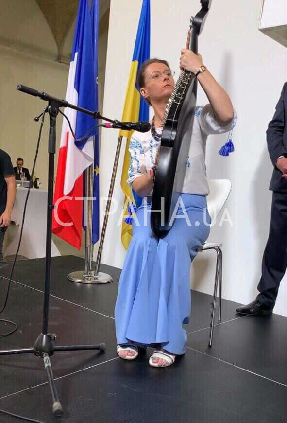 Посол Франции Изабель Дюмон играет на бандуре. Фото корреспондента "Страны"