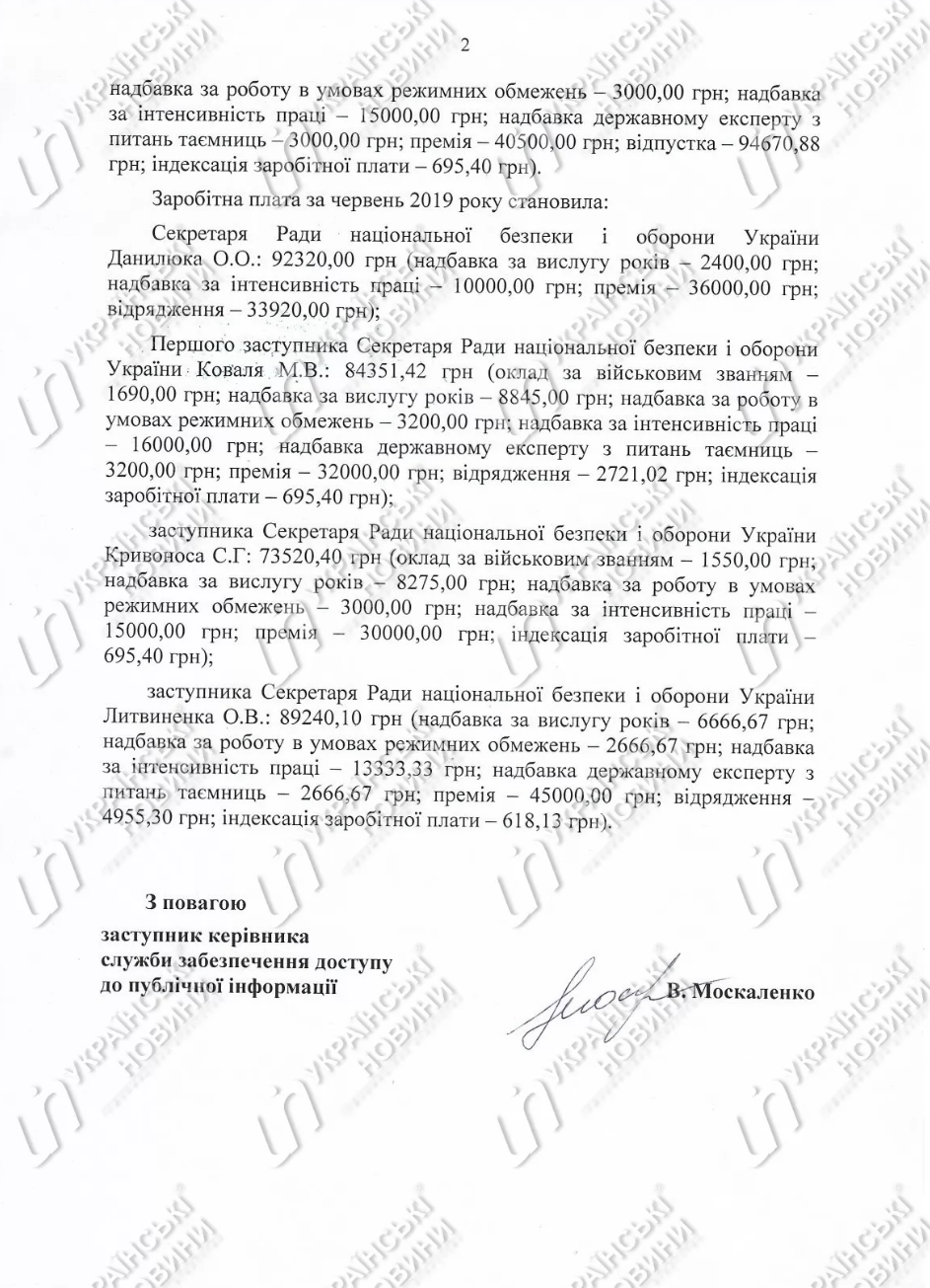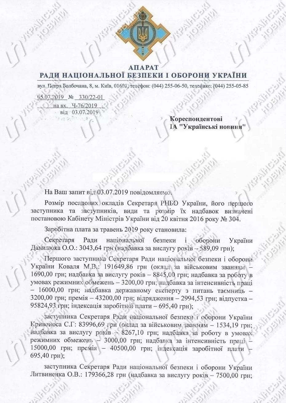 "Заработная плата секретаря СНБО А. Данилюка за июнь 2019 года составляла 92 320 гривен (надбавка за выслугу лет - 2 400 гривен, надбавка за интенсивность труда - 10 000 гривен, премия - 36 000 гривен, командировка - 33 920 гривен)", - сказано в ответе СНБО.