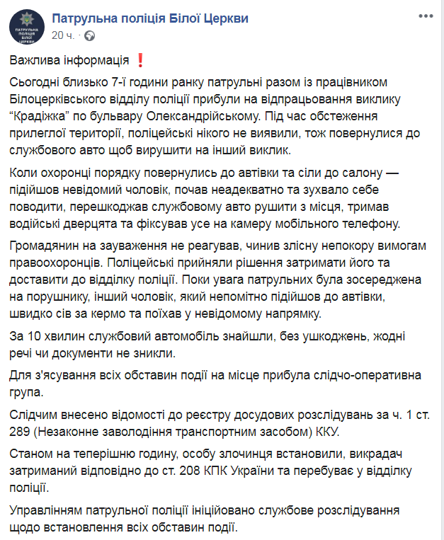 "За 10 минут служебный автомобиль нашли без повреждений, вещи и документы не исчезли", - заявила патрульная полиция Белой Церкви.