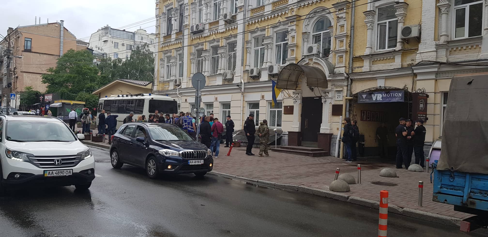 Пока митингующих под зданием не наблюдается, но поодиночке заходят в здание суда люди в военной форме и с шевронами "Добровольческий украинский корпус".