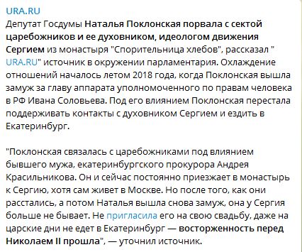 Ранее URA.RU в своем Telegram-канале сообщило, что Поклонская перестала поддерживать контакт с сектой царебожников и Сергием.