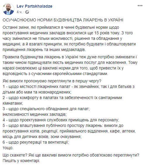 "Правила строительства больниц в Украине очень нужно менять и таким образом повышать качество медицинских услуг для населения. Поэтому сейчас обновляем эти важные нормы для того, чтобы привести их в соответствие с современными европейскими стандартами", - написал Парцхаладзе.