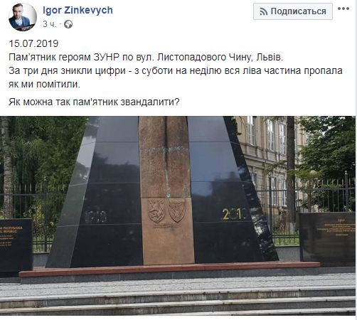 "Памятник героям ЗУНР по ул. Листопадового Чина, Львов. За три дня исчезли цифры - с субботы на воскресенье вся левая часть пропала, как мы заметили", – отметил он. С монумента исчезли числа 1918 и 2018, которые символизировали 100-летие создания ЗУНР.