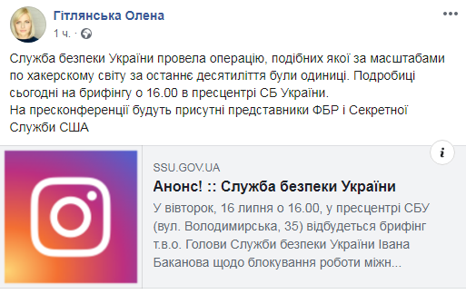 Сотрудники Службы безопасности Украины (СБУ) провели очень масштабную операцию среди хакеров, "подобных которой по масштабам за минувшее десятилетие были единицы". Об этом говорится на Facebook-странице пресс-секретаря СБУ Елены Гитлянской.