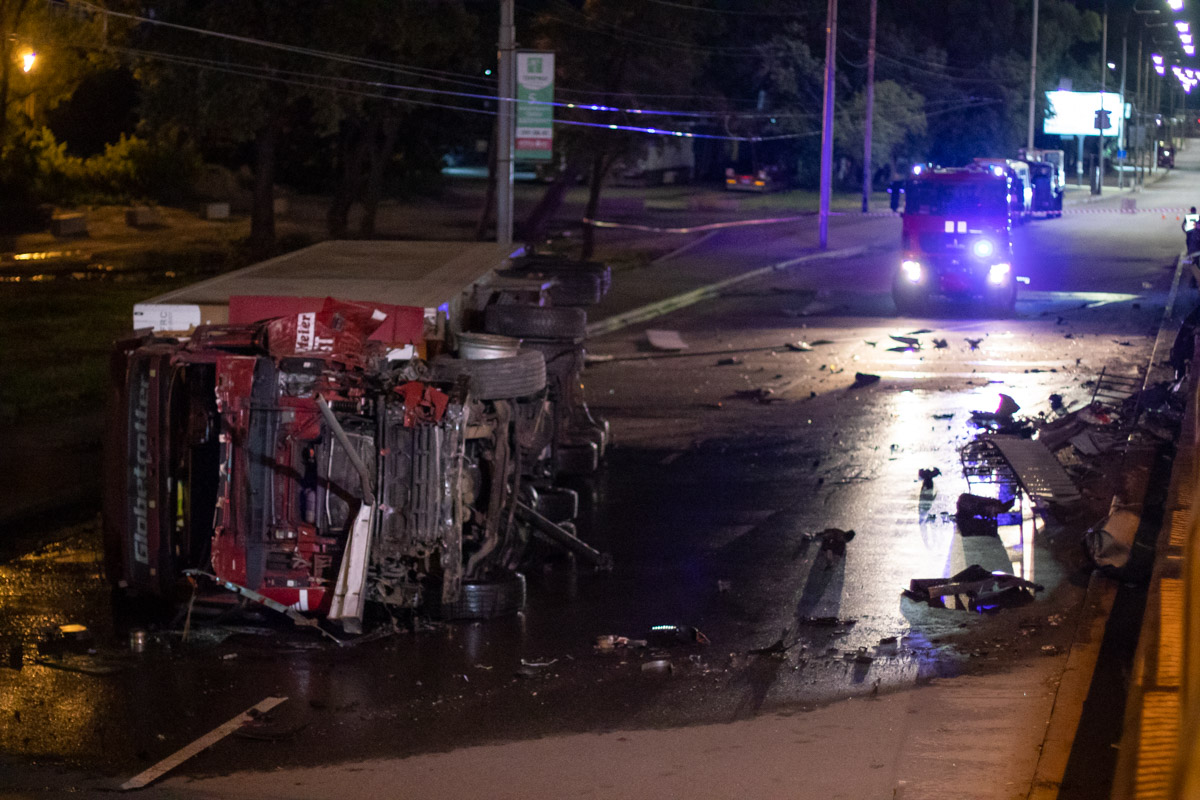 Отмечается, что грузовик ехал со стороны Одесского направления по Окружной. Около 02:00 в районе Одесской площади, заезжая на мост транспортной развязки, его резко начало нести вправо. На своем пути многотонная машина снесла два столба и отбойник, вылетела с моста, упав на правый бок. К месту аварии сразу направились патрульные, чтобы помочь водителю. Тягач повредил линии электропередач, которые упали на встречную фуру, а водитель автомобиля Toyota не успел среагировать и напоролся дном легковушки на элементы поврежденных столбов.