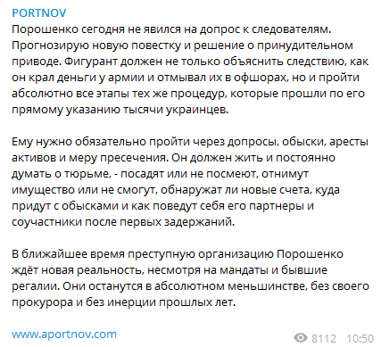 "Прогнозирую новую повестку и решение о принудительном приводе. Фигурант должен не только объяснить следствию, как он крал деньги у армии и отмывал их в офшорах, но и пройти абсолютно все этапы тех же процедур, которые прошли по его прямому указанию тысячи украинцев", - сказал Андрей Портнов.
