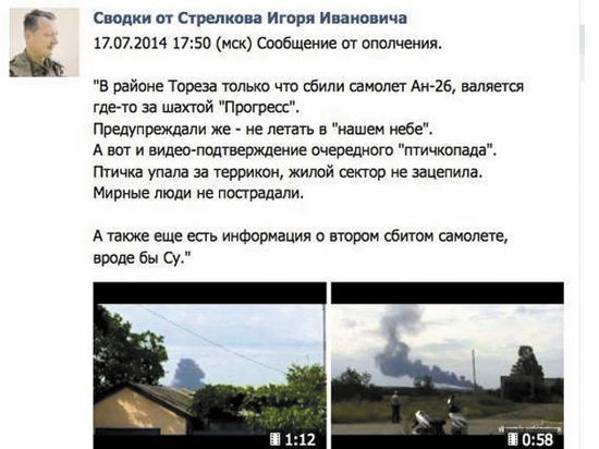 Также скорее всего свою роль сыграло и сообщение, появившееся на ВК-страничке "Сводки Стрелкова Игоря Ивановича" сразу после гибели "Боинга". В нем говорилось, что сепаратисты сбили украинский транспортник Ан-26.