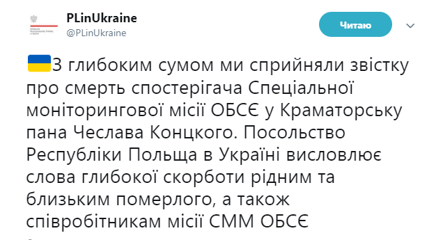 "С глубокой скорбью мы восприняли известие о смерти наблюдателя Специальной мониторинговой миссии ОБСЕ в Краматорске господина Чеслава Концкого. Посольство Республики Польша в Украине выражает слова глубокой скорби родным и близким умершего, а также сотрудникам миссии СММ ОБСЕ", - говорится в сообщении.