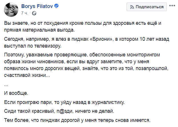 В этом же сообщении Филатов похвастал тем, что похудел и влез в старый пиджак элитного бренда.