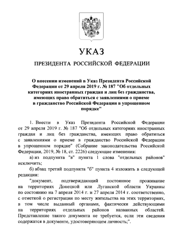 Указ опубликован на Официальном интернет-портале правовой информации. Этот документ вносит изменения в ранее опубликованный указ президента РФ от 29 апреля 2019 года "Об отдельных категориях иностранных граждан и лиц без гражданства, имеющих право обратиться с заявления о приеме в гражданство РФ в упрощенном порядке".