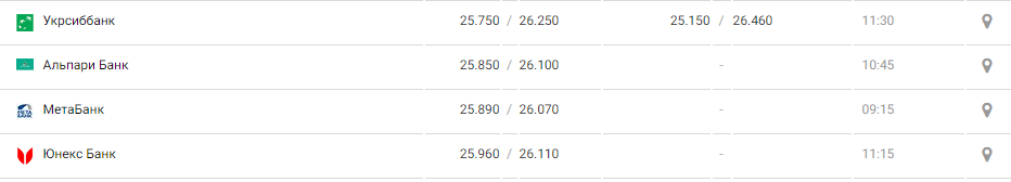 На 10:00 курс доллара в Приватбанке был - 25,8/26,150; Райффайзен банк Аваль 25,65/26,1; Альфа банк доллар - 25,8/26,15; Укрсоцбанк 25,8/26,15; ОТР банк - 25,8/26,1; Укрсиббанк - 25,7/26,15, Ощадбанк - 25,8/26,3; курс доллара Пумб - 25,8/26,3.