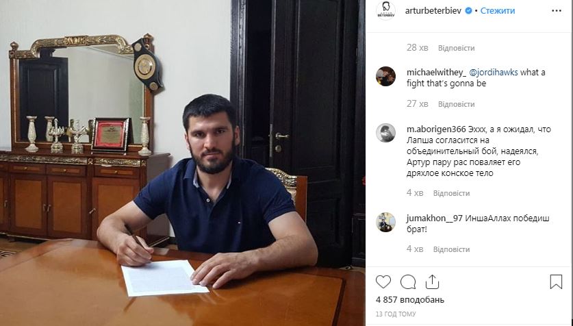 Украинский чемпион мира по версии WBC в полутяжелом весе Александр Гвоздик свой следующий поединок проведет 18 октября против россиянина Артура Бетербиева. Российский боксер подписал контракт на бой о чем и сообщил в Instagram.