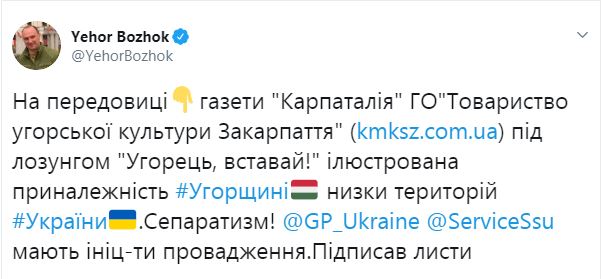 "На первой странице газеты "Карпаталия" ОО "Общество венгерской культуры Закарпатья" под лозунгом "Венгр, вставай!" иллюстрирована принадлежность к Венгрии ряда территорий Украины. Сепаратизм! ГПУ и СБУ должны инициировать производство. Подписал письма", - написал Божок.