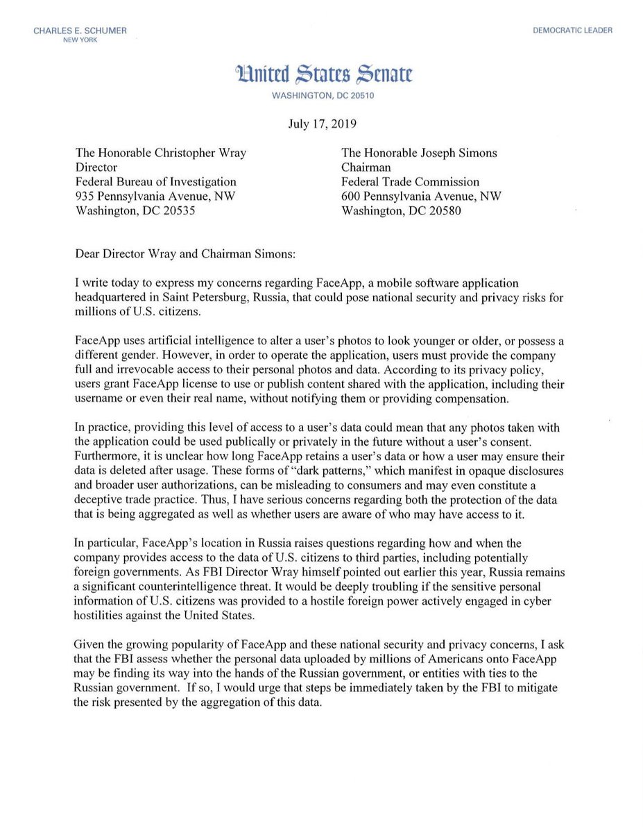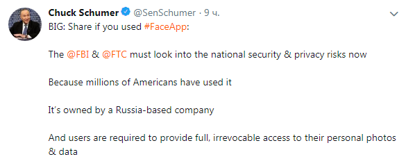 В США сенатор Чак Шумер обратился к Федеральной комиссии по торговле и ФБР с просьбой проверить приложение FaceApp из-за того, что его разработчиком является российская компания. Об этом Шумер написал в Twitter.