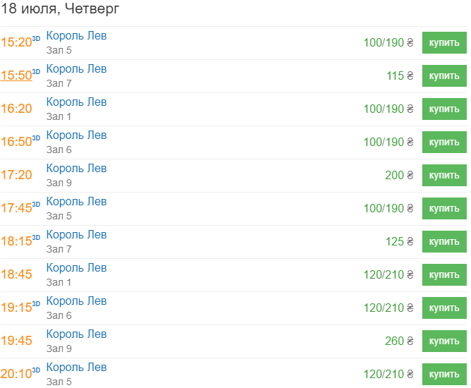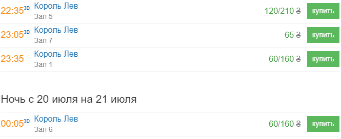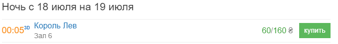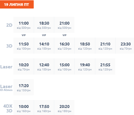 18 июля начала показа в кинотеатре - с 14:40. Стоимость билетов - от 100 до 200 грн. (до 18:55). Вечерние сеансы будут стоит дороже - в 19:15 за билеты Lux - 260 грн, в 19:20 - 220 грн, в 20:05 - от 120 грн., в 20:30 - от 110 грн. Сеансы оканчиваются в 23:45. После 23:00 билет будет стоить 60 грн.