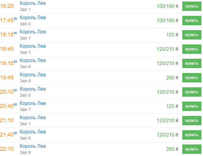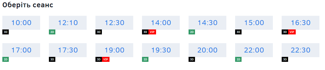 Начало сеансов - с 10:00, окончание - 22:30. Билеты Standard стартуют от 70-100 грн., VIP - 500 грн, сеансы с 19:30 - по 180 грн за билет.