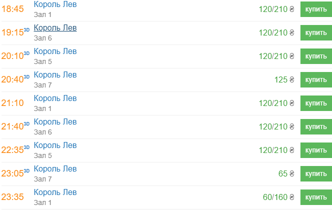Начало показа в ТРЦ "Океан Плаза" в Киеве - в 11:00. Вип-зал обойдется в 500 грн за место. С 11:50 до 16:30 билеты 3D будут стоить от 80 грн. В 18:50 и 21:05 посмотреть "Король Лев" можно будет за 120 грн. В 23:25 - билеты значительно подешевеют и будут стоить около 70 грн. При этом билеты типа Laser стоят от 70 до 120 грн в вечернее время.