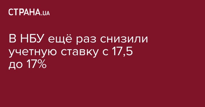 В Национальном банке Украины приняли решение с июля понизить учетную (ключевую) ставку до 17% годовых с 17,5%, на которых она удерживалась с конца апреля.