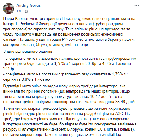"Вчера Кабинет министров принял постановление, которым ввел специальную пошлину на импорт из Российской Федерации дизельного топлива (трубопроводным транспортом) и сжиженного газа. Такое совместное решение президента и правительства принято в ответ на расширение российских экономических санкций", – написал Герус.