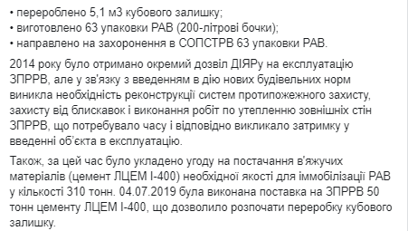 Также, за это время было заключено соглашение на поставку вяжущих материалов (цемент ЛЦЕМ И-400) необходимого качества для иммобилизации РАО в количестве 310 тонн. 04.07.2019 была выполнена поставка на ЗПЖРО 50 тонн цемента ЛЦЕМ І-400, что позволило начать переработку кубового остатка.