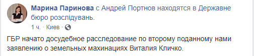Напомним, накануне Марина Паринова сообщила, что ГБР начало расследование по заявлению о преступлении по земельным махинациям Виталия Кличко. Речь о сделке с ООО "Роялти Тетрабуд", которая получила 0,14 га земли на проспекте Победы в Киеве для строительства и эксплуатации жилого дома.