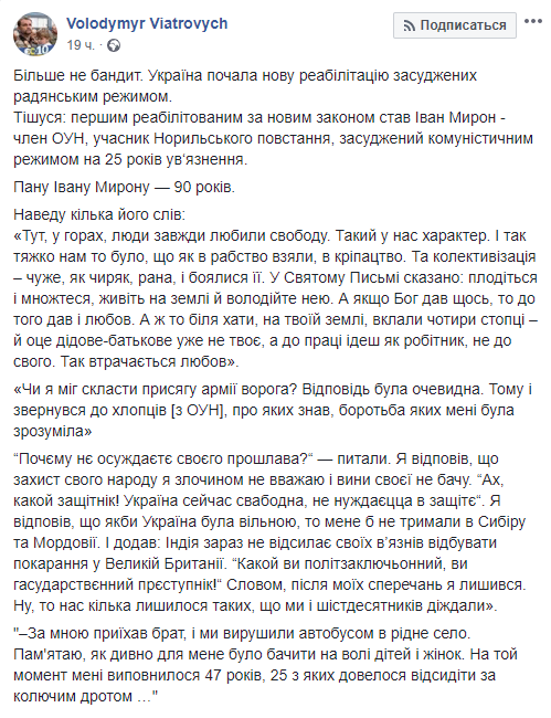 "Больше не бандит. Украина начала новую реабилитацию осужденных советским режимом", - так реабилитацию Мирона прокомментировал председатель УИНП Владимир Вятрович.