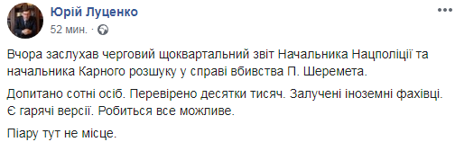 "Вчера заслушал очередной ежеквартальный отчет начальника Нацполиции и начальника Уголовного розыска по делу убийства П. Шеремета. Допрошены сотни человек. Проверено десятки тысяч. Привлечены иностранные специалисты. Есть горячие версии. Делается все возможное. Пиару здесь не место", - говорится в опубликованном сообщении.