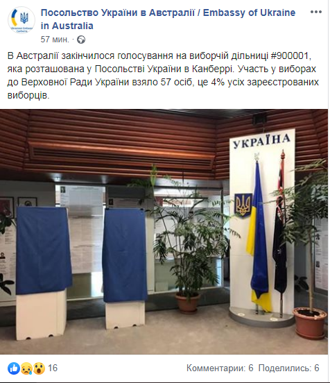 "В Австралии завершилось голосование на избирательном участке №900001, расположенном в посольстве Украины в Канберре. Участие в выборах в Верховную Раду Украины приняли 57 человек, это 4% всех зарегистрированных избирателей", - сказано в сообщении посольства.