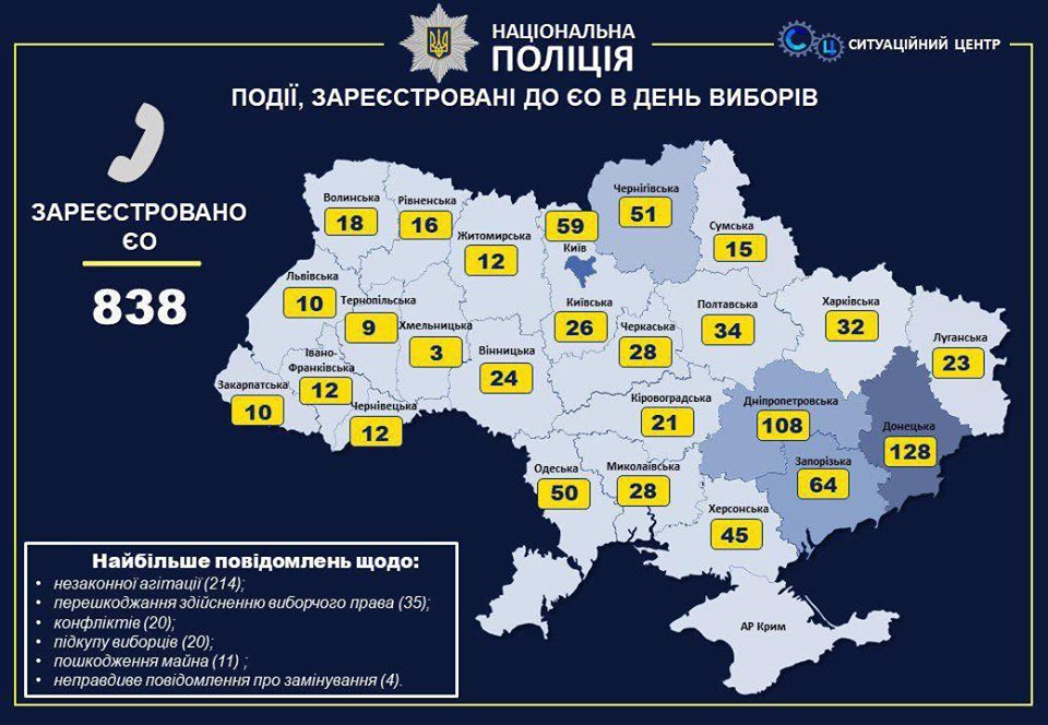 Так, сообщается, что в полицию поступило 838 заявлений и сообщений, связанных с избирательным процессом, из них больше всего в Донецкой, Днепропетровской и Запорожской областях. В основном указанные факты связаны с незаконной агитацией - 214, препятствием осуществлению избирательного права - 35, конфликтами - 20, подкупом избирателей - 20, повреждением имущества - 11, сообщениями о заминировании - 4.