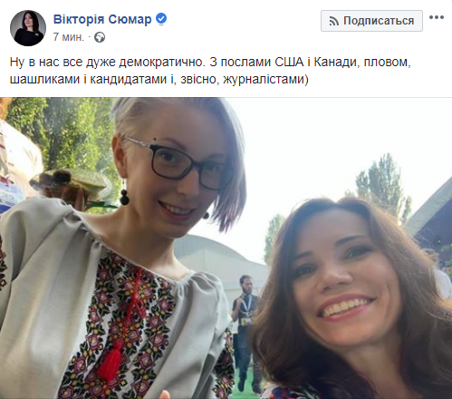 "У нас  все очень демократично. С послами США и Канады, пловом, шашлыками и кандидатами и, конечно, журналистами", - написала Сюмар и выложила несколько снимков с фуршета, который проходит на свежем воздухе.