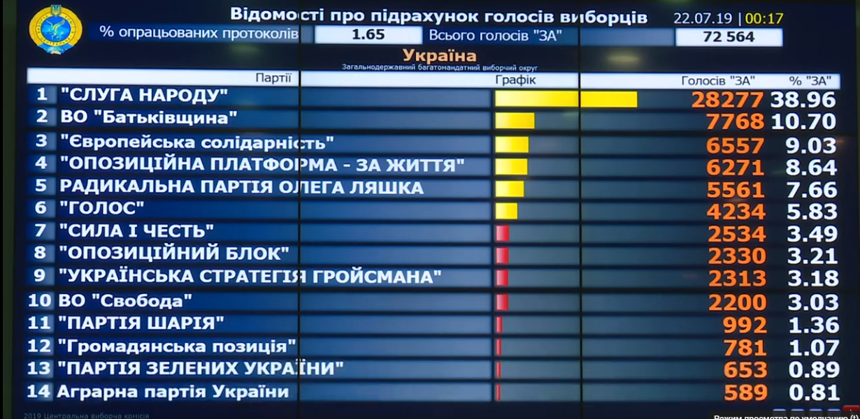 ЦИК обработала больше полутора процента бюллетеней. Лидирует "Слуга народа" с 38,96%, у радикалов - почти 8%