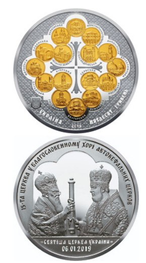 На аверсе монеты изображены малый Государственный Герб Украины (слева внизу), полукругом надписи (Украина, год чеканки монеты - 2019 и номинал). В центре крестом располагаются позолоченные медальоны с изображениями кафедральных соборов поместных православных церквей мира. Крестообразную композицию венчает позолоченный оттиск печати Вселенского патриарха Варфоломея.