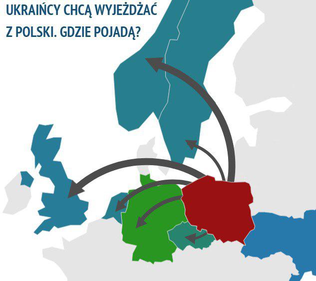 Основными направлениями для миграции являются Германия, Чехия, Норвегия, Нидерланды, Швеция и Великобритания. Также каждый 20-й работающий в Польше и готовый к отъезду украинец мечтает переехать в США. Сами украинцы признают, что к переезду их побуждают более высокие заработки и поведение польских работодателей.