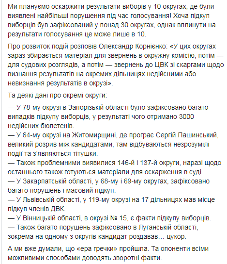 В "Слуге народа" считают, что именно в 10-ти округах было зафиксировано больше всего серьезных нарушений во время голосования. В частности отмечается, что подкуп избирателей зафиксировали в 30-ти округах, однако именно в десяти это нарушение могло повлиять на результаты выборов.
